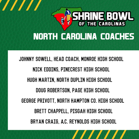 Chris Norman, Athletic Director of the Shrine Bowl of the Carolinas, also announced the coaches selected for the 2023 North Carolina Tar Heels and the South Carolina Sandlappers. He added, “These coaches have been selected and approved to coach their respective teams in the 87th game.”